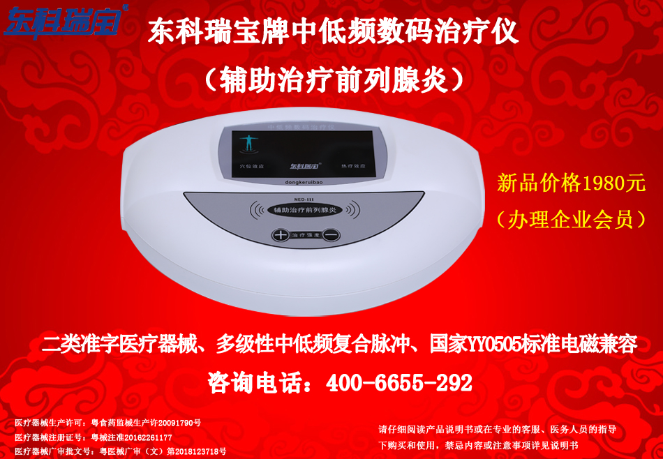 東科瑞寶牌前列腺治療儀器-中低頻數(shù)碼治療儀<家用系列/醫(yī)用系列>,為輔助治療前列腺炎等疾病專(zhuān)用泌尿外科男科治療儀器設(shè)備,屬于二類(lèi)醫(yī)療器械產(chǎn)品,采用多級(jí)性中低頻復(fù)合脈沖電流,根據(jù)前列腺特性而專(zhuān)門(mén)設(shè)計(jì)的電腦程序控制,利用理療電極片等配件耗材輸出,并通過(guò)特定穴位經(jīng)絡(luò)釋放起到相關(guān)治療理療作用,操作簡(jiǎn)單方便,廠(chǎng)家三包質(zhì)保,提供客服一對(duì)一指導(dǎo)服務(wù),2019年度新產(chǎn)品優(yōu)價(jià)發(fā)售,并贈(zèng)送雙倍會(huì)員積分,可兌換豐富會(huì)員禮品和會(huì)員優(yōu)先服務(wù)。
