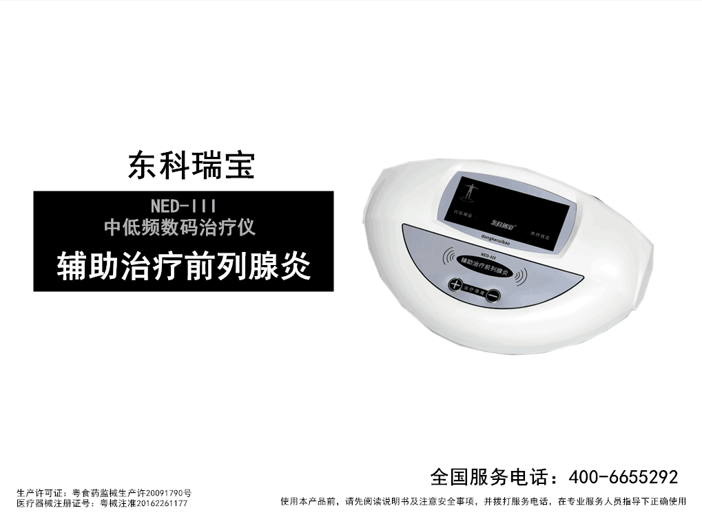 (2019新款)東科瑞寶牌前列腺治療儀器系列產(chǎn)品(輔助治療前列腺炎專用中低頻數(shù)碼治療儀),為國(guó)家二類醫(yī)療器械治療型產(chǎn)品,由治療儀主機(jī)、導(dǎo)電理療電極片、DC導(dǎo)線、前列腺儀器設(shè)備專用固定帶等配件耗材組成。